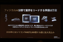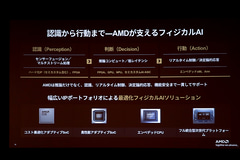 AMDでは現在、FPGAやアダプティブSoCを含む製品群を強化し、ロボティクスや自動車などの「フィジカルAI」領域に注力している。ザイリンクス買収による製品への統合、高速コンピューティングIPの活用およびパッケージング技術の統合により、幅広いポートフォリオを提供できるようになり、AIの学習から推論、エッジデバイスでの実装まで多様なワークロードに対応でき、フィジカルAI実現に至る全体をカバーできるという。