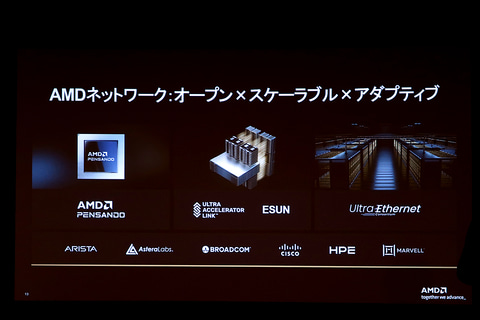 新たな取り組みとして、ラック規模のハイパースケール向けラックシステム「Helios」を紹介した。これは、買収したZT Systemsのデザイン能力を活用し、AMDが持つCPU、GPU、NICなど各製品を統合したラックレベルのソリューションを、リファレンスとしてパートナーシップを通じて提供するものだ。ネットワーク接続には、プロプライエタリな技術ではなく要望の多いUltra Ethernetを採用する。