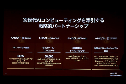 日本AMDは、都内でAI関連製品や技術を紹介する「ADVANCING AI 2025 JAPAN」を開催。メディア向けラウンドテーブルや企業向けの基調講演を行ない、各分野におけるAI戦略と最新の事業動向を説明した。また、AMD製品を搭載する各メーカーが出展、デバイスの展示や紹介を行なった。