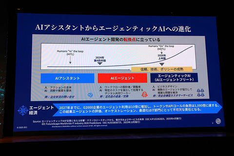 同氏は、これまでおよび現在のAIは、どうしても人間の介入が必要であるため、そのポテンシャルを生かしきれていないと指摘。IDCの調査の中で、AI導入でローンチに至った企業が6割、そのうち成功したのは一桁台程度に留まっているという。本格的なAI活用には、複数のAIエージェントが互いに協力しつつ複雑なタスクを遂行する「エージェンティックAI」が主となり、人間がそれを見ているだけで済む時代へ移行しなければならないだろうとした。