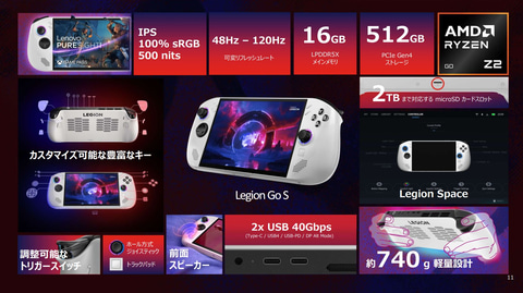 Legion Go Sは、コントローラ一体型の筐体を採用し、携帯性を重視した約740gの軽量モデル。プロセッサにはRyzen Z2 Goを採用し、メモリに16GB LPDDR5X、ストレージに512GB SSD、OSにWindows 11 Homeを搭載する。ディスプレイは8型IPSタッチパネルで、解像度はWUXGA、リフレッシュレートは可変で48~120Hzに対応する。