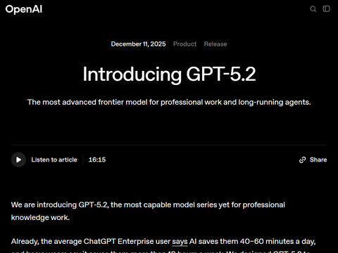 OpenAIは12月11日、専門的な知識業務などの性能を大幅に向上させた新型AIモデル「GPT-5.2」を提供開始した。ChatGPT Plus/Pro/Go/Business/Enterpriseプラン向けには順次展開を開始しており、API経由での利用も可能となっている。