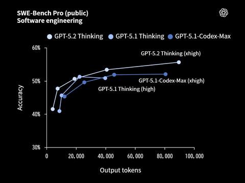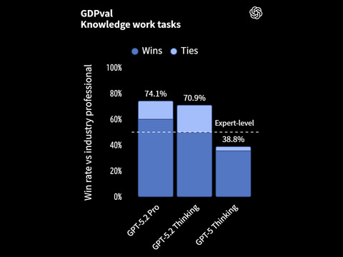 GPT-5.2は、専門的な知識業務やコーディング、数学/科学、画像認識など幅広い領域で性能を改善した新型AIモデル。プレゼンやスプレッドシートの作成などを含む、知識業務タスクの能力を測るGDPvalでは、新モデル「GPT-5.2 Thinking」がタスクの70.7%において、業界トップクラスの専門家と同等以上の成果物を、11倍以上の速度で生成したとしている。