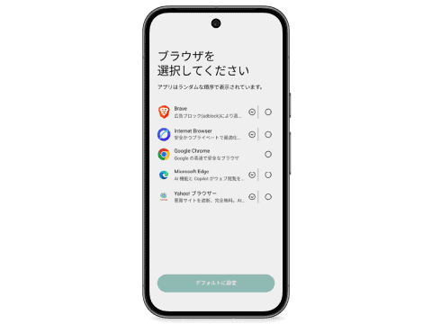 12月18日より段階的に展開する選択画面も、従来の延長線上にあるものだが、公正取引委員会の要求に従った実装をしているのが特徴。たとえば、公平となるよう順番がランダムに表示される5つの選択肢を提示し、事前の選択はない。また、Webブラウザ/検索サービス提供者は、名前とともに独自の説明や宣伝文を表示できる。