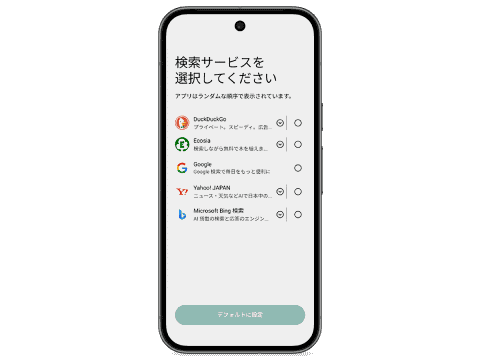 スマホ新法は、日本の公正取引委員会が競争の促進と、公正でオープンなデジタル市場の確立を目的とする新しい法律。2025年3月26日にGoogleの一部サービスがこの法律の対象として指定された。このためGoogleは選択画面の表示義務を遵守する必要が生じ、それに準拠した実装の導入を行なった。