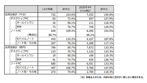 電子情報技術産業協会(JEITA)が発表した2025年11月のPC出荷実績は、販売台数が前年同月比3.6%増の73万2,000台となった。前年(2024年)実績を上回ったものの、2025年9月が同86.4%増、10月は同30.2%増という高い伸びを見せていたのに比べると、成長には急ブレーキがかかった格好だ。