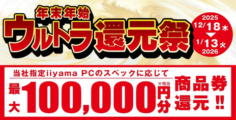 そのほか、12月20日から2026年1月12日までの間に対象PC/組立キットを購入して「パソコン工房×えなこ2026オリジナルカレンダー」がもらえるキャンペーンや、元日に公式X(旧Twitter)から発信される投稿を引用ポストするとZETA DIVISIONのファン太さんや鈴木ノリアキさんが組み立てたサイン入りゲーミングPCが当たる抽選、対象PCの購入で最大10万円相当の商品券が還元される「年末年始ウルトラ還元祭」など、さまざまな企画が展開される。