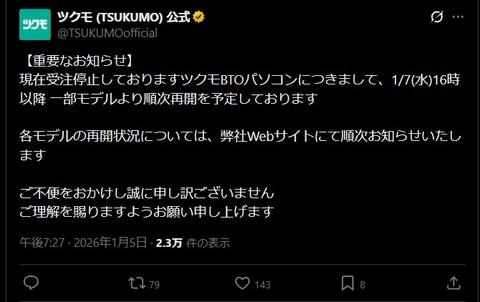 TSUKUMOは1月5日、公式X(旧Twitter)アカウントにおいて、現在受注停止しているBTO PCの一部モデルの受注を、1月7日16時以降に順次再開すると発表した。