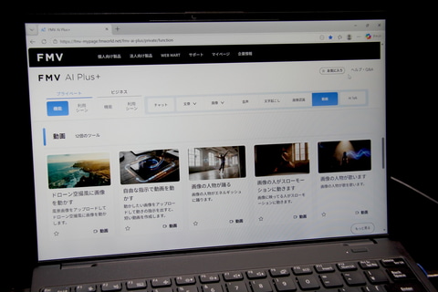新サービス「FMV AI Plus+」は、複数の生成AIモデルを統合した月額定額制のプラットフォーム。ユーザーは「どのAIモデルを使うか」を意識する必要がなく、「旅行動画を作りたい」「自己PRの文章を書きたい」といったやりたいことをカード形式のメニューから選ぶだけで、最適なAIが自動的に選択され実行される。