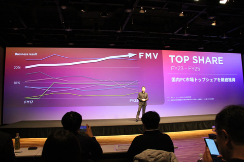 大隈氏は冒頭で、昨年(2025年)のブランドリニューアル以降、モバイルPCのラインナップ強化により若年層や女性層へのアプローチに成功していると強調。家電量販店における販売実績では2023年以降の国内PC市場トップシェアを維持しているという。