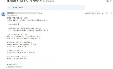 この偽社長/偽上司を装ったメールの内容は、「(業務のプロジェクトのためなど理由は適当、あるいは理由なし)LINEグループを作成して、そのQRコードを送ってグループに招待してくれ」といった一見、業務に思えるような内容。弊社の社内でも同様のメールが届いている。