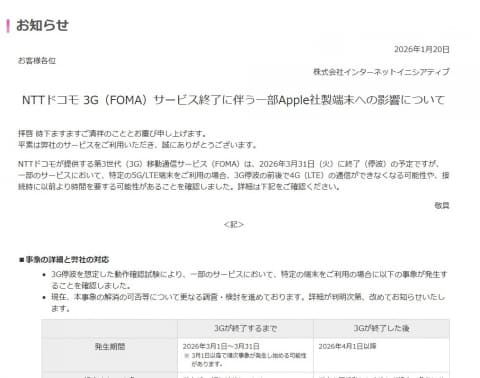 インターネットイニシアティブ(IIJ)は1月20日、NTTドコモが提供する3G移動通信サービス「FOMA」が3月31日に終了(停波)することを想定し、同社が動作確認試験を実施したところ、iPhoneが一部サービスにおいて影響を受けることを確認したと発表した。