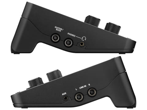 インターフェイスは、48Vファンタム電源対応マイク/ラインイン用XLRジャック、ラインイン用6.35mm標準ジャック2基(L/R)、ラインアウト用6.35mm標準ジャック2基(L/R)、ギター/ベース入力用6.35mm標準ジャック、AUX入力用ステレオミニジャック、ヘッドフォン用6.35mmステレオ標準ジャック、ヘッドフォン用ステレオミニジャック。