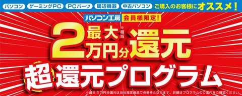 パソコン工房では、購入した対象PCのスペックに応じて最大3万円分相当の還元が受けられる「新生活スタートダッシュ還元祭」や、指定保証サービスへの加入で最大2万円分の還元が受けられる「最大2万円分還元 超還元プログラム」なども実施している。