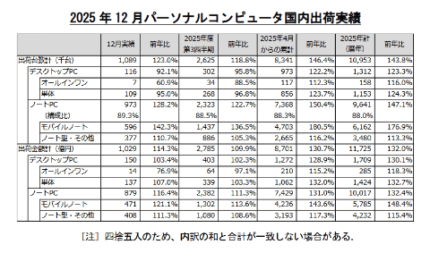 一般社団法人電子情報技術産業協会(JEITA)は、2025年(2025年1月~12月)の国内PC出荷実績を発表。出荷台数は前年比43.8%増の1,095万3,000台、出荷金額は同32%増の1兆1,725億円となった。