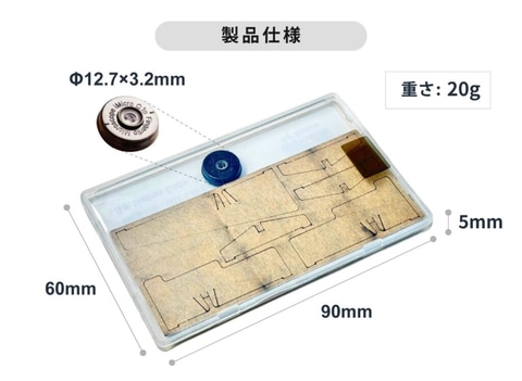 microHunter MH-X250Pの本体サイズは12.7×12.7×3.2mm、重量は約0.5g。観察に必要な一式が揃った「ミクロハンターキットlite」は、サイズは90×60×5mm、重量は約20gで、財布のカード入れに収められる程度の大きさ。