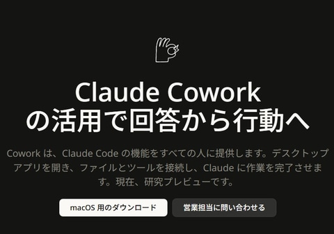執筆時点で、Claude Coworkの日本語サイトでは「macOS用のダウンロード」と表記されているが、ダウンロードページではWindows用ファイルも提供されている。