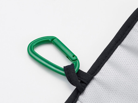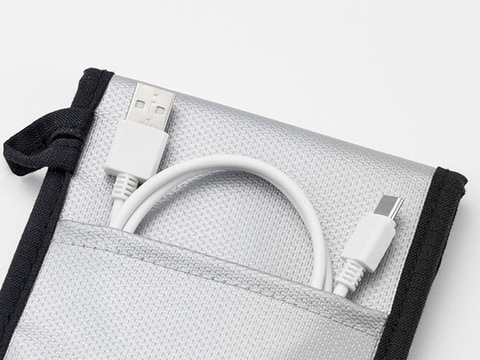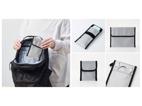 ポーチの入口部分を折り返して隙間を塞ぐことで、万が一の発火時に火や煙が漏れにくい構造を採用している。機内持ち込みや自宅での保管にも適しているという。背面にはケーブルなどを収納できるポケットを装備し、側面にはカラビナやストラップを通せるループが付いている。