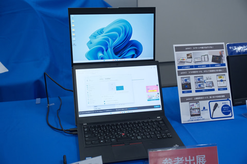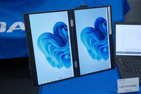報道関係者向けに事前に行なわれた内覧会では、開発中の折りたたみ式2画面モバイルモニターも参考展示されていた。
