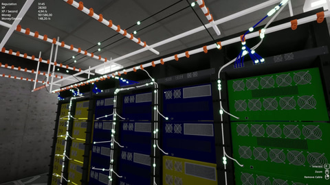 「Data Center Demo」は、何もないフロアにデータセンターを構築、運営するシミュレーションゲーム。プレイヤーはラック、サーバー、スイッチなどのハードウェアを購入して配置し、手作業でEthernetケーブルを配線してネットワークを構築していく。
