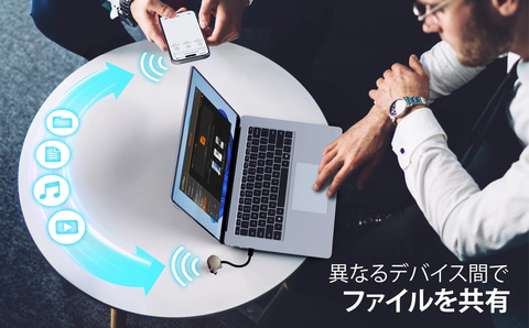 JUAW22は、PCとiPad/iPhoneとワイヤレスで接続し、シームレスな連携を可能にするUSBドングル。双方向でのデータ転送を行なえるほか、PCに接続したキーボードとマウスでiPad/iPhoneを操作することもできる。
