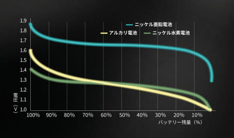 充放電制御用のICチップを内蔵し、過負荷/漏電/短絡/過電圧/過熱/高温から保護。過充電や過放電を抑え、長寿命と高出力を両立した。また構造的に可燃性の電解液を含まないため、リチウム系電池と比べて発火リスクを抑制。容量を使い切る直前まで1.6Vの電圧を維持できる点も特徴としている。