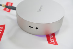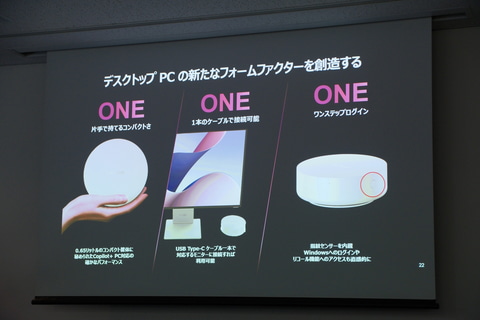 円柱状のデザインを採用し、片手で持てるコンパクトさで設置場所を選ばないのが特徴。USB Power Delivery給電による駆動もサポートしており、対応するモニター製品とUSB Type-Cケーブル1本で接続して使える。本体側面には電源ボタン一体型の指紋認証センサーを備えており、Windows Helloによるログインをはじめとした生体認証を利用できる。