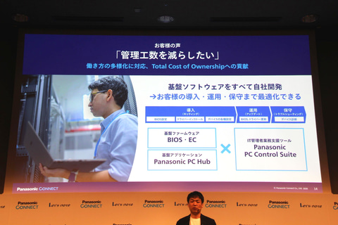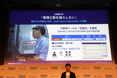 さらに、パナソニックではBIOSなどのファームウェア、管理用の基盤アプリケーションとなる「Panasonic PC Hub」、そしてIT管理者向け業務支援ツール「Panasonic PC Control Suite」などすべてを自社開発した。これにより、ITツールでPCを効率的に管理可能になり、運用にかかる手間をさらに削減可能だという。また、SC6/FC6と今回の3モデルで共通のIT管理/設定が可能となっており、過去モデルを導入している会社が追加購入する場合にも利点がある。