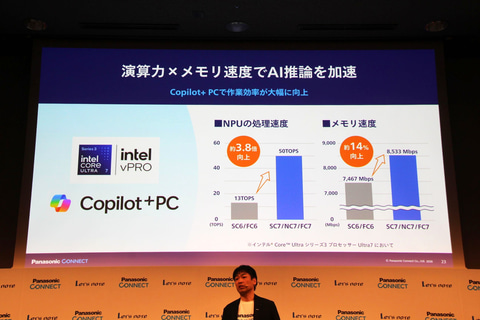 上記の通り、今回の3モデルはレッツノートシリーズ初のCopilot+ PC対応製品である。NPU性能は前世代比で約3.8倍に向上、メモリ性能は約14%向上し、快適にAIが使用可能な性能を備えているという。