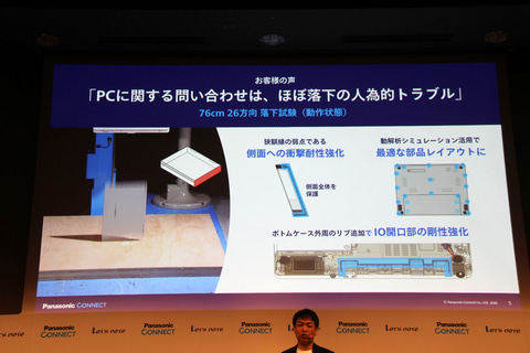 破損原因の中でも大部分を占めるという落下については、76cmの高さから、26通りの向きでの落下試験を実施、これに耐える強度を確認している。これにより、持ち運びや通常使用において想定される高さからの落下に対応できるという。