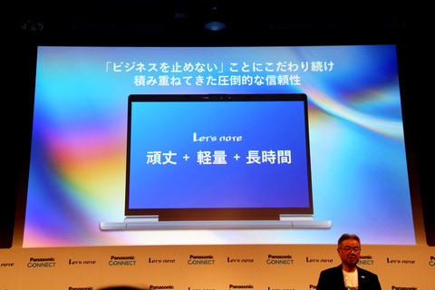 発表会では、同社代表取締役社長の樋口泰行氏、同社執行役員の山本清高氏、プロジェクトマネージャーの堀直樹氏、ダイレクターの重野敬人氏らが登壇し、レッツノート新ラインナップの製品特長や販売方針について説明した。