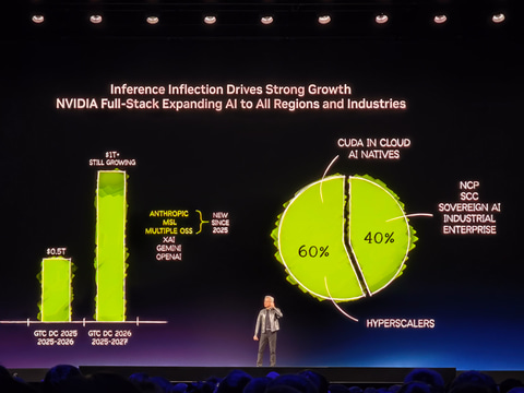 フアン氏は「AI市場には転換点が到来したと考えている。既にChatGPTが必要とする処理能力は、2023年の1万倍になっている。昨年(2025年)のGTCの段階で2025~2026年には500億ドルの市場可能性があると説明したが、予想をアップデートして、2025年~2027年に1兆ドルの市場規模だと予測している」と述べ、AI推論の市場が爆発的な勢いで成長する可能性があると説明した。