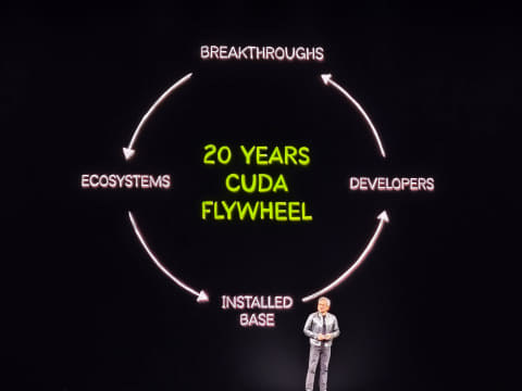 さらに転機を迎えたのが、2006年に発表したCUDAのリリースだ。CUDAは、現在エンタープライズ事業の事業本部長であるイアン・バック氏らがスタンフォード大学の学生だった頃に開発したソフトウェアで、フアン氏はCUDAの可能性にいち早く気づき、バック氏ごとNVIDIAに取り込み、2006年に正式にリリースした。このため、2026年はCUDAのリリース以来20周年の記念の年で、GTCの初日に行なわれたフアン氏の基調講演でもそれについての言及があった。