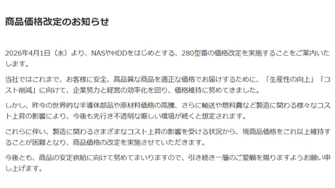 アイ・オー・データ機器は3月18日、USBメモリやHDD、SSD、NASなど計280型番を4月1日より値上げすると発表した。価格改定率が最も高いのはUSBメモリで最大224%。