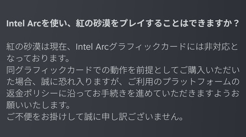 紅の砂漠の「よくある質問」ページにて、本作はArc搭載ビデオカードに対応していないこと、および同ビデオカードでのプレイを見込んで購入した場合には返金手続きを進めてほしい旨が記載されている。