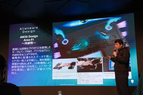 Alienware 16/18 Area-51の2機種では、底面のサーマルバンプ部分に独自の冷却機構として、クアッドファンのCryo-Chamberを内蔵。従来と比べて静音性が15%、エアフローが37%向上し、性能が最大17%引き上がるとしている。一部上位モデルではカバーにGorilla Glassを採用しており、内部が見えるデザインとなっている。