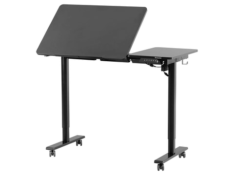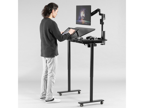 電動昇降機能はボタン操作で高さを調節できる。最大4パターンの高さを記憶するメモリ機能と衝突検知機能も備える。ロック付きキャスターが標準付属するほか、高さ調節ネジ(固定アジャスター)も同梱される。