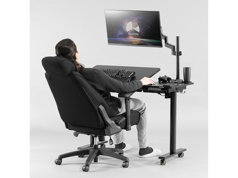 天板は幅65cmの可動チルト部と幅35cmの固定水平部のハイブリッド構造を採用。最大40度の無段階チルトにより、用途に合わせた角度調整が行なえる。メイン天板に傾斜をつけた状態でも、右側の固定水平エリアにマウスや飲み物を安定して置ける。