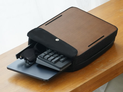 ケースは自立するデザインで、内部は大きく3つに分かれており、ノートPC、キーボード、周辺機器を別々に収納可能。着脱式ストッパーやペンを収めるポケットも備える。13型以下のノートPCや14型MacBook Pro/Airなどに対応し、A4サイズの書類やクリアファイルも収納できる。