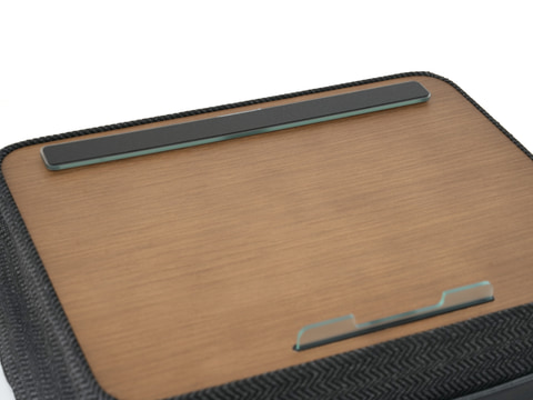 天板は膝上でも作業しやすい高さや角度に調整されているほか、ノートPCの滑り落ちを防ぐ着脱式アクリル製ストッパーを同梱。タブレットやキーボードを載せた際にズレを防ぐ着脱式グリップバーも用意している。さらに、3Dプリンタを使って拡張アタッチメントを自身で作ることもできる。