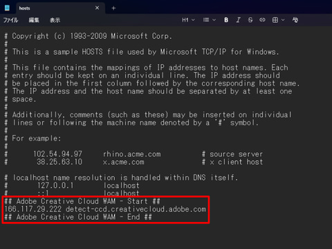 海外掲示板のReddit上の3月中旬頃の投稿によれば、ユーザーが自身のhostsファイルが変更されていることに気付き、ファイルを確認してみたところ、Adobeによるものと思われる設定が書き加えられていたという。同スレッド内で検証を行なった別のユーザーによると、Adobeが自社のWebサイト上でCreative Cloudのインストール状況を検出するために利用しているものだという。