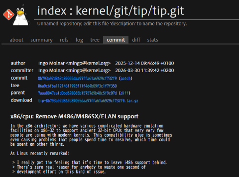 具体的には、Linux 7.1に適用予定のパッチにおいて、Kconfigのオプションから「CONFIG_M486」「CONFIG_M486SX」「CONFIG_MELAN」が削除される可能性がある。動作に必要な最低限の機能としてi486がサポートしていない「TSC」および「CX8」が必須となり、i486の実機でLinux 7.1以降の起動ができなくなる。