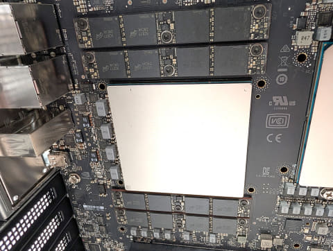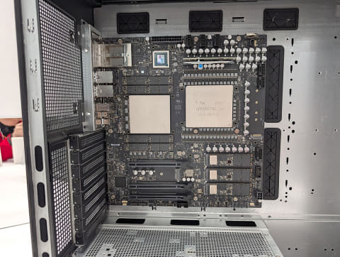 本製品で注目すべきはCPUとGPUのチップだ。同社の展示では、デスクトップの側面が開放された物が展示されており、内部のCPUやGPUのチップが丸裸になっているのだが、これらチップがとにかくデカい!右側のチップの型番に「GB110」の文字が書かれており、AI特化のNVIDIA Blackwell Ultraの可能性が高そうだ。また、もう1つの大きなチップは「TH500」の文字が確認できることから、こちらがGrace CPUと思われる。これら型番については、角度や光の当たり具合で文字が見えたり消えたりするほど薄いラインで型番が記されている。