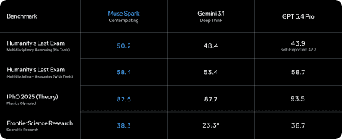 Muse Sparkは、ツールユース、視覚的思考連鎖、およびマルチエージェントオーケストレーションをサポートするマルチモーダル推論モデル。マルチモーダル知覚、推論、健康管理、エージェント処理に長けているほか、複数のエージェントを並列に推論させる「熟考モード(Contemplating mode)」も搭載し、「Gemini Deep Think」や「GPT Pro」といった他社の最先端モデルに対抗できるとしている。