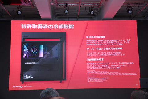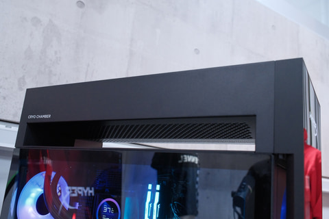 本体上方には最大360mmまでの水冷クーラーに対応する「OMEN Cryo Chamber」を装備。メインケースから独立したチャンバーにラジエーターを配置し、常に新鮮な外気を取り入れられる設計とすることで、冷却性能を高めて高負荷時でも安定したパフォーマンスを維持できる。ケースデザインの面では、サーマルバンプや排気孔の大型化によりエアフローの改善も図っている。