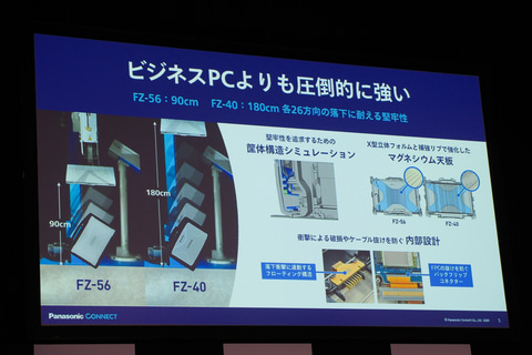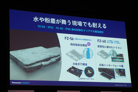その上で同氏は、今回投入する新製品がこういった状況を打開できると説明し、FZ-56は現場でもオフィスでも使える堅牢性と機動性を両立した製品、一方のFZ-40は絶対に止められないミッションクリティカルな現場に高い信頼性をもたらす製品だと紹介。どちらも耐衝撃性をはじめとした圧倒的な堅牢性、2つのバッテリやホットスワップによる長時間駆動、現場のニーズに応える拡張性を兼ね備え、別格の信頼性をユーザーに提供するとアピールした。