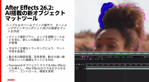 After Effects 26.2では、AI搭載のオブジェクトマットツールが導入された。これはPremiereのオブジェクトマスクに相当するような機能で、髪の毛の精密処理、空気表現、動きの速い被写体といった複雑なマットにも対応する。