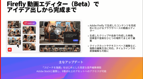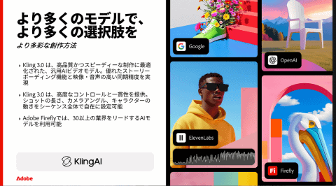 Fireflyでは、AIで生成した動画コンテンツを完成形に仕上げるためのブラウザベースの動画エディターがベータとして提供される。これにより生成したクリップや映像、効果音や音楽を1つの場所でまとめて編集できるようになる。加えて、高品質かつスピーディーなAIビデオ生成モデル「Kling 3.0」が選べるようになった。
