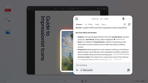 Google Lensの機能も備えており、画面上に表示されているものを選択して検索可能。画像やテキストの翻訳なども行なえる。Google検索のAIモードにも対応している。
