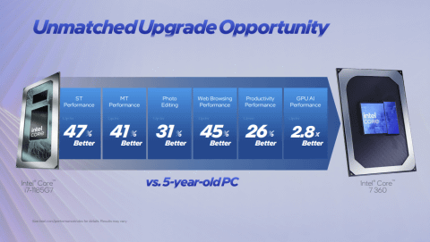 5年前のPCと比較して、シングルスレッド性能は最大47%、マルチスレッド性能は最大41%、GPUのAI性能が最大2.8倍向上。その一方で価格も抑えられ、学生、家族、中小企業、エッジ環境に好適としている。